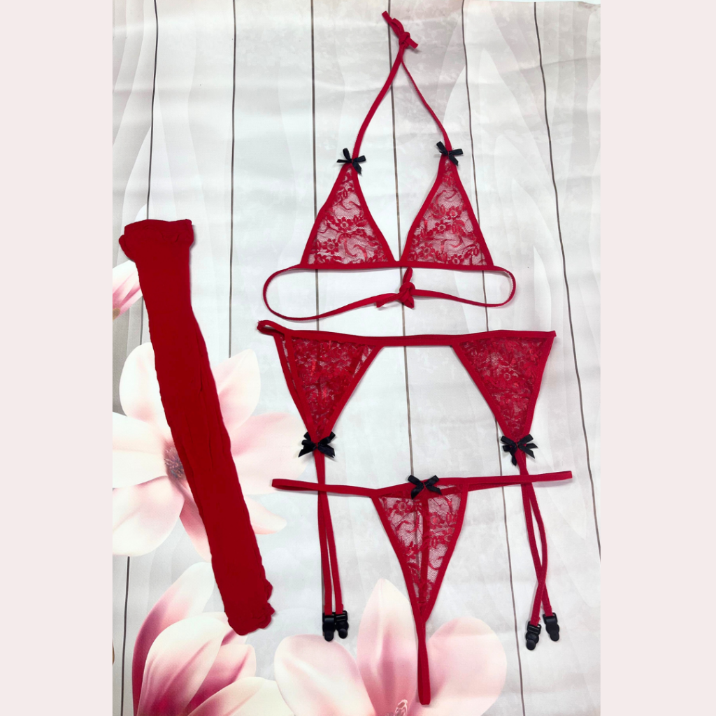 Bacio Fantezi Kırmızı Dantelli Fiyonklu Jartiyer Takım BC8526