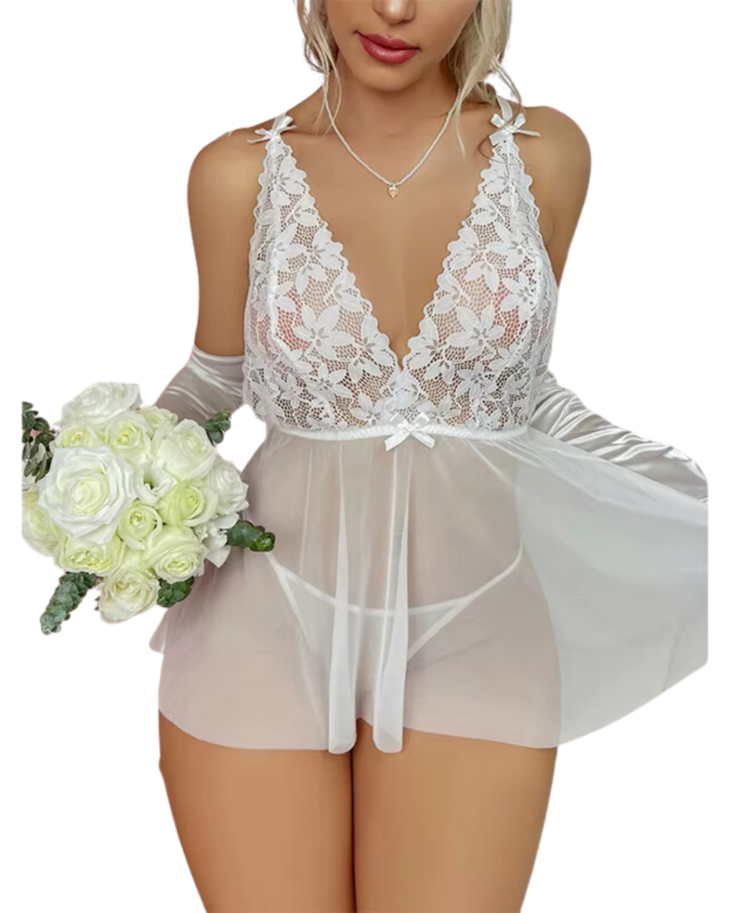 Fantezi Beyaz Dantelli Transparan Tül Etekli Seksi Elbise Gecelik BC3266